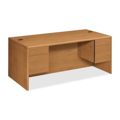 10700 Series Double Pedestal Desk with 0.75" H Pedestals?HON10791CC Features: -Desk.-Material: High-pressure laminate.-Abrasion and stain resistant laminate with elegant hardwood trim.-Drawers ride on steel ball bearing suspensions.-File drawers extend fully and accommodate letter and legal size hanging files.-"One Key" core removable locks make re-keying quick and easy.-Full-height modesty panel for privacy.-Two grommets on work surface for cable management. Color/Finish: -Finish: Harvest.-Modular management solution that combines stylish profiles and elegant accents with top grade fit and finish. Dimensions: -Locking box / file pedestals height: 0.75".-Dimensions: 29.5" H x 72" W x 3" D.