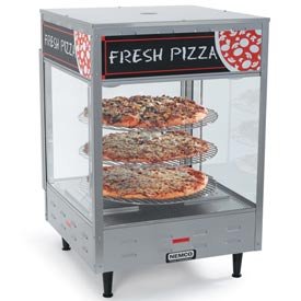 #Size: 18-1/2" x 18-1/2" x 33-7/8". Let NEMCO Hot Food Merchandisers stimulate added sales of your fresh pizza and other hot foods. Tiered units are ideal for holding and displaying up to 3 products at once, holding them at controlled temperatures for better flavor and appearance. For added appeal, these cases feature colorful signage to increase sales and enhance presentation. Stainless steel, tempered glass construction. Lighted interior and attractive signage give added impact. Water reservoir keeps foods moist.