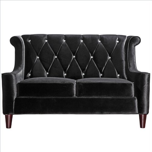 Armen Living Barrister Loveseat in Black?Tufted back seating adds a rich touch to this high back, velvet, transitional loveseat. Armen Living is the quintessential modern-day furniture designer and manufacturer. With flexibility and speed to market, Armen Living exceeds the customer's expectations at every level of interaction. Armen Living not only delivers sensational products of exceptional quality, but also offers extraordinarily powerful reliability and capability only limited by the imagination. Our client relationships are fully supported and sustained by a stellar name, legendary history, and enduring reputation. The groundbreaking new Armen Living line represents a refreshingly innovative creative collaboration with top designers in the home furnishings industry. The result is a uniquely modern collection gorgeously enhanced by sophisticated retro aesthetics. Armen Living celebrates bold individuality, vibrant youthfulness, sensual refinement, and expert craftsmanship at fiscally sensible price points. Each piece conveys pleasure and exudes self expression while resonating with the contemporary chic lifestyle. Features: Loveseat from the Barrister collection Black velvet with crystal buttons Tufted, high back adds style and comfort Measures 60 inches wide by 35 inches deep by 38 inches high Comes with standard 1 year limited warranty