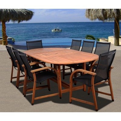 Amazonia Jersey 9 Piece Dining Set?SC_359_8MANHA Features: -Material: 100pct high quality eucalyptus wood.-Free feron gard wood preservative for longest strap durability.-Works great against the effects of air pollution salt air, and mildew growth.-For best protection, perform this maintenance every season or as often as desired.-Great functionality. Includes: -Includes 1 Oval extendable table and 8 Armchairs. Assembly Instructions: -Some assembly required. Dimensions: -Table dimensions: 29" H x 71" - 93" W x 43" D.-Armchairs dimensions: 37" H x 22" W x 23" D. Collection: -Amazonia collection.